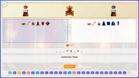 Untuk memulai petualangan Anda di Hangman: Royal Duel, cukup pilih mode permainan Anda. Dalam mode pemain tunggal, Anda akan menghadapi permainan itu sendiri, menebak huruf untuk mengungkapkan kata tersembunyi sebelum atribut kerajaan Anda habis. Dalam mode duel, tantang komputer atau ajak teman untuk bersaing secara langsung melawan Anda. Setiap pemain bergantian menebak huruf untuk menyelesaikan kata sambil secara strategis menghilangkan atribut kerajaan lawan. Kuncinya adalah bukan hanya menebak dengan benar tetapi juga memprediksi langkah selanjutnya dari lawan Anda!